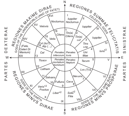THE HEAVENSIn Etruscan religion, the sky is spilt into 16 equal parts that are each owned by one aiser. The skies are then further spilt into four equal sections for the gods of the underworld, sea, sky, and land. Lightning struck from that part of the sky would be a message from that aiser. Tins, as the main lightning throwing god, has several pieces of the heavens.The heavenly regions would phenologically change as the year progressed in relation to Usil. Omens from from eastern parts are favourable, meanwhile the western side was unfavourable. The outermost regions are ruled by Usil and Tiv.See A New Reconstruction of the Etruscan Heaven for a more detailed, complex reconstruction of the heavens.